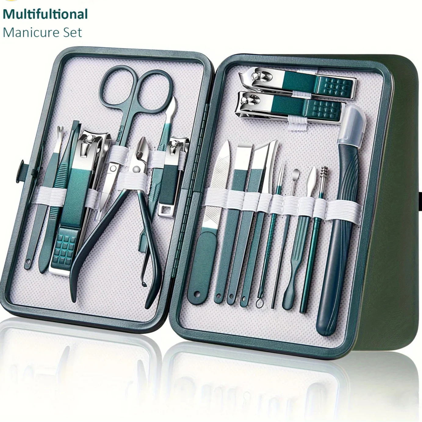 - 18 Pcs Manicure Kit for Women and Men - Beautifully made manicure set; ideal for foot, hand ,facial care. The set contains nail clippers for finger and toenails, peeling knives, cuticle trimmers, toenail nipper, nail file, v-shaped push stick, eyebrow tweezers, multi-purpose scissors, blackhead needle with loop remover, nail kit and an ear pick.